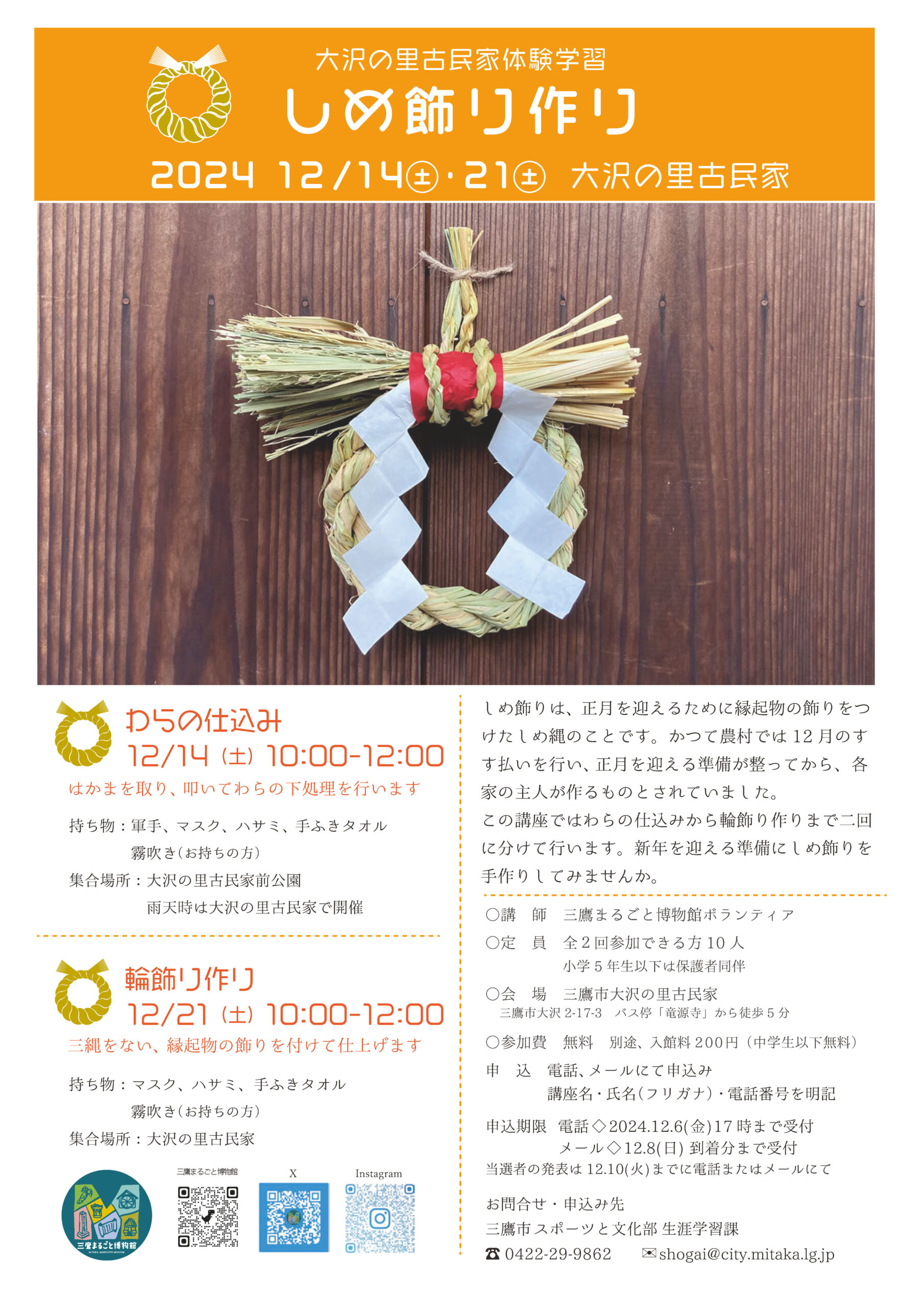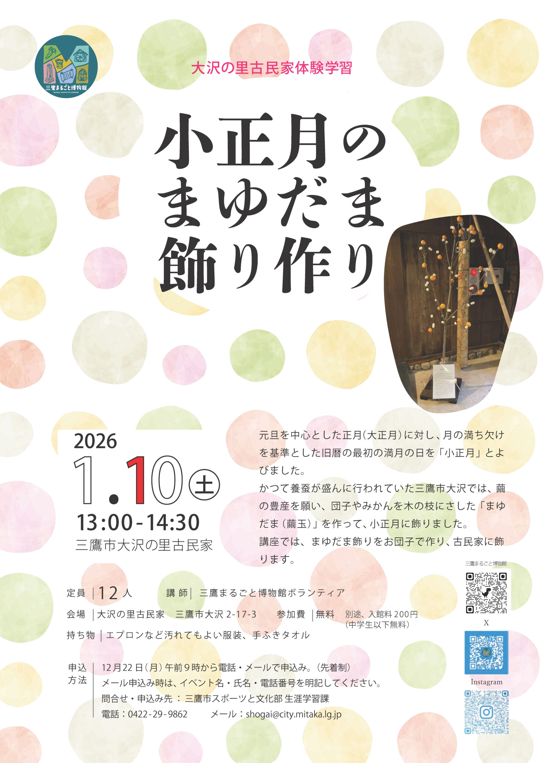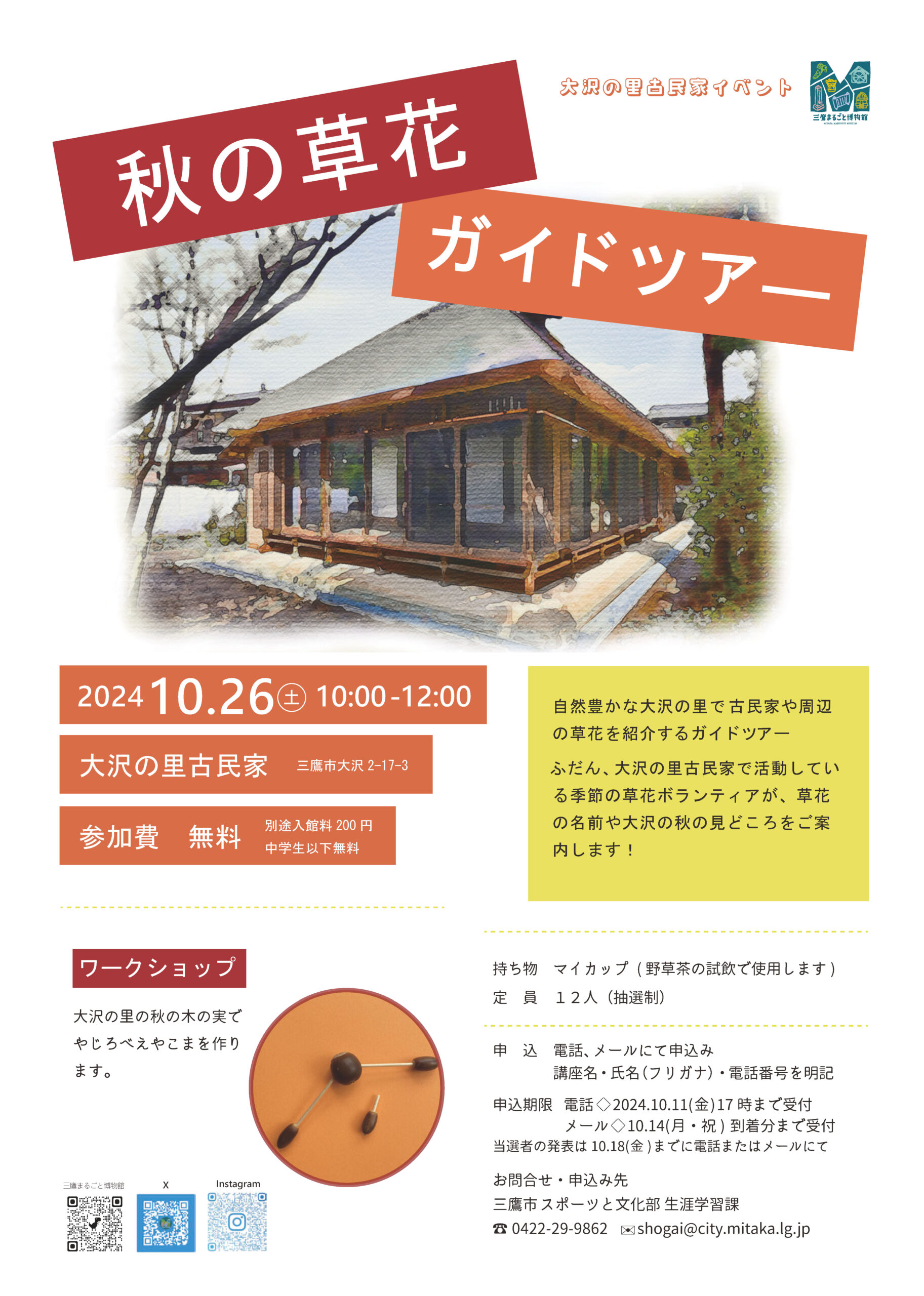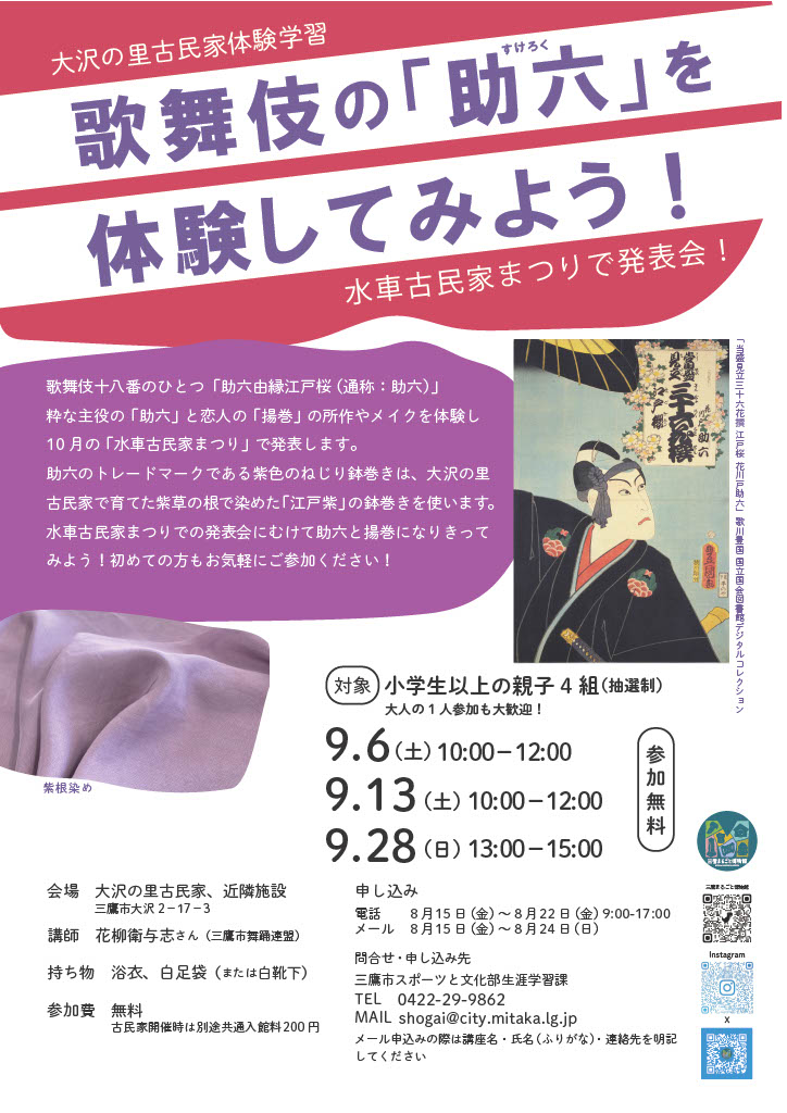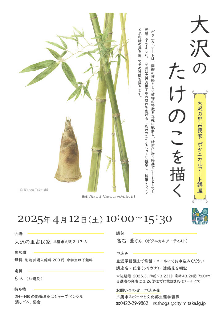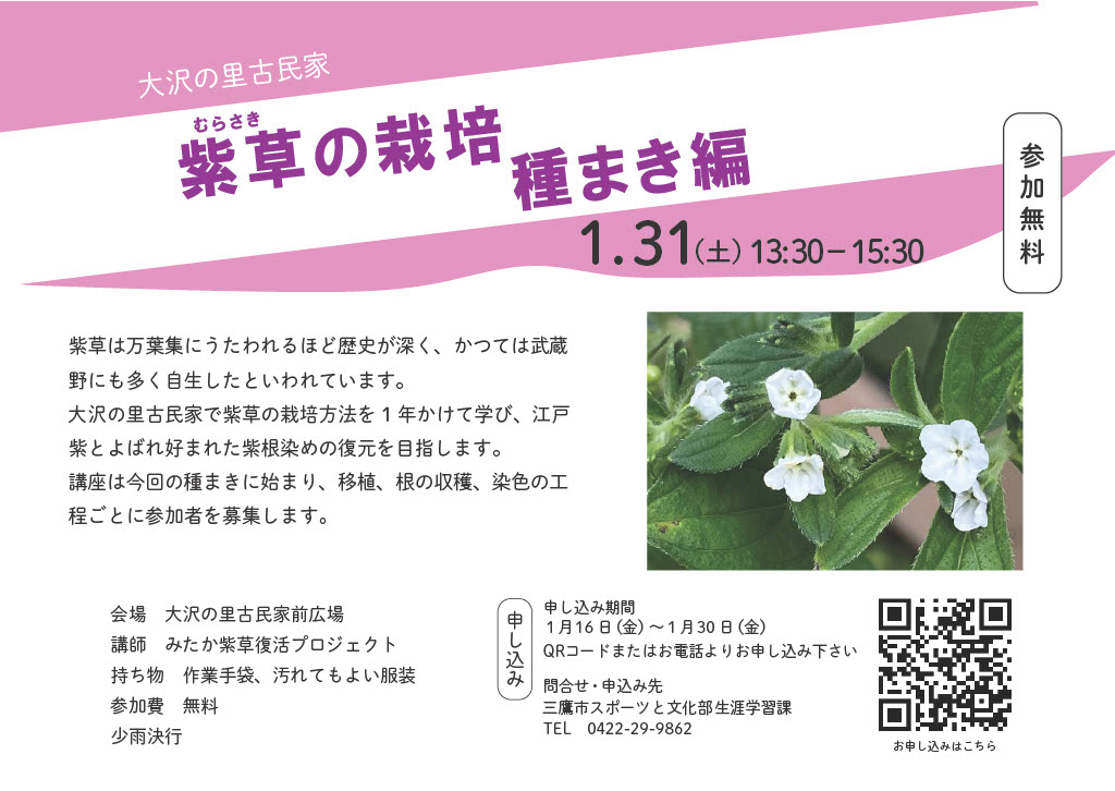Activity Log 活動履歴 2026.1.31 紫草の栽培 種まき編 2026.1.10 小正月のまゆだま飾り作り 2025.10.4-5 水車古民家まつり 2025.9.6・13・28 歌舞伎の「助六」を体験してみよう 2025.4.12 大沢のたけのこを描く 2025.3.16 古の影 ソーラーで照らす妖怪影絵 2024.12.14・21 しめ飾り作り 2024.10.6 秋の草花ガイドツアー 2024.10.5-6 水車古民家まつり 2024.9.14 万葉の香りを楽しむ フジバカマの匂い袋作り 2024.7.27 夏の草花ガイドツアー 2024.6.15 ボタニカルスケッチ 2024.4.27 春の草花ガイドツアー 2024.3.9 ボタニカルアート 三鷹大沢わさびを描く 2024.2.24-12.7 みたか紫草復活に向けて紫草を一緒に育てませんか 2024.2.17 季節の草花ガイドツアー春寒 2024.1.13 小正月のまゆだま飾り作り 2023.12.9・23 しめ飾り作り 2023.12.2 三鷹大沢わさびーその歴史と遺伝的特徴ー 2023.11.18 紫草の根掘り 2023.10.28 季節の草花ガイドツアー 爽秋の大沢をめぐる 2023.10.22 三鷹まるごと博物館交流会 2023.10.14-15 大沢の里 水車・古民家まつり 2023.9.23 万葉の香りを楽しむ フジバカマの匂い袋作り